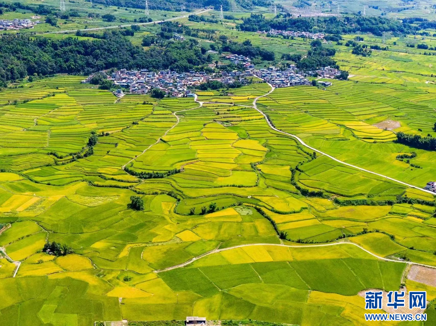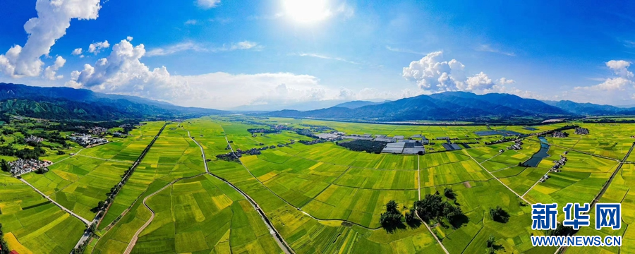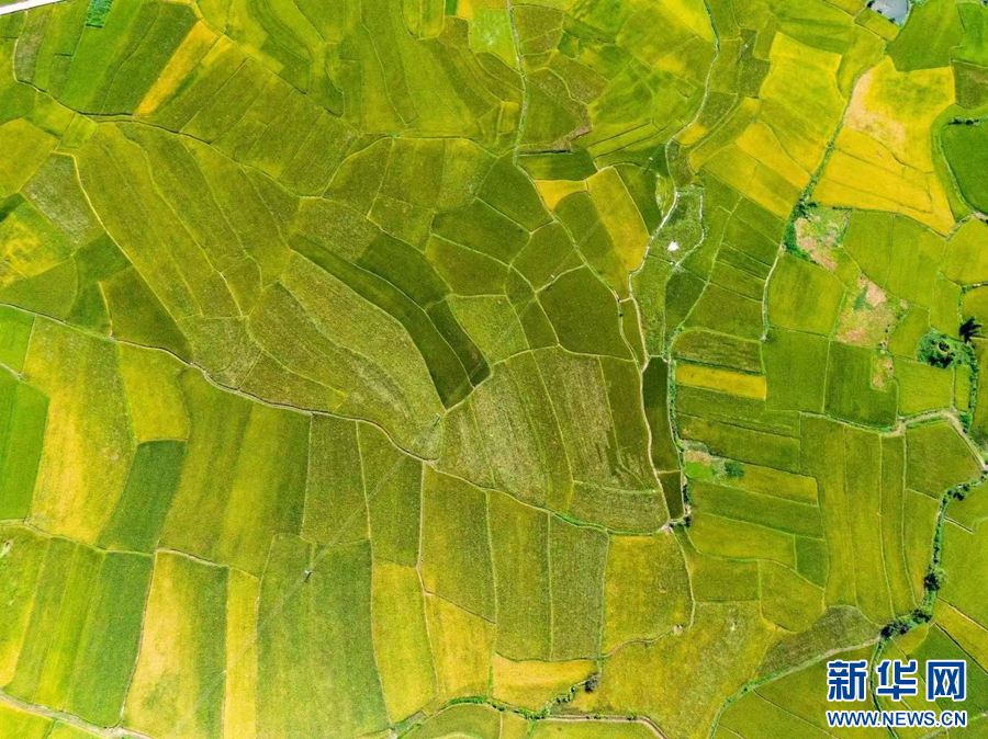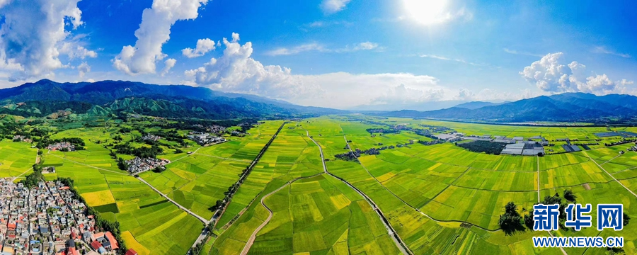近日,在云南省德宏傣族景颇族自治州盈江县,31.66万亩稻田即将迎来丰收,航拍镜头中的稻田已经呈现出淡淡的金黄,在阳光下格外美丽。