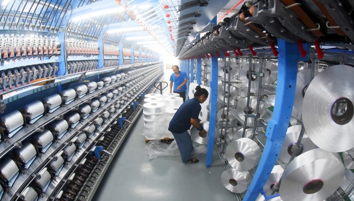 8月20日,江苏连云港某毛毯公司,工人在设备更新后的加弹车间里忙碌