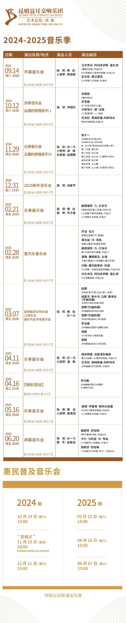 在昆明聂耳交响乐团2024-2025音乐季中,不仅回响着古典音乐史上的不朽之作,以此纪念多位伟大的古典音乐巨擘,更通过推出建团15周年以来的原创作品音乐会以及委约新作的世界首演来展现乐团对于新时代的深切体悟与前瞻性的艺术探索。