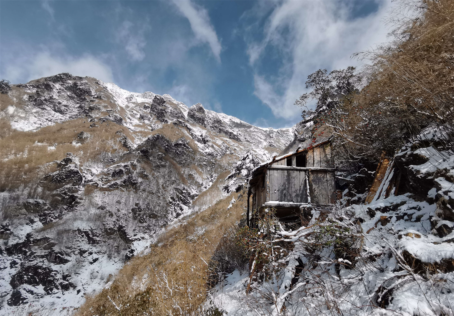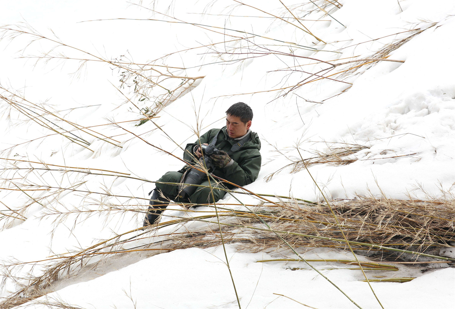 白尾梢虹雉的繁殖地都在悬崖峭壁上,从营地到巢址的路都是陡坡和悬崖,再加上下雪,有些地段积着厚厚的雪,每次去蹲守都是一路艰辛,一路惊险。王斌说,下雪的时候,大雪会把竹子全部压倒,踩在上面非常难走、非常滑,有时候可能上去一步就会往后滑三四步。不同的巢址,走的路程也不一样,正常情况下要走一个多小时,远一些的地方可能要走两个多小时。