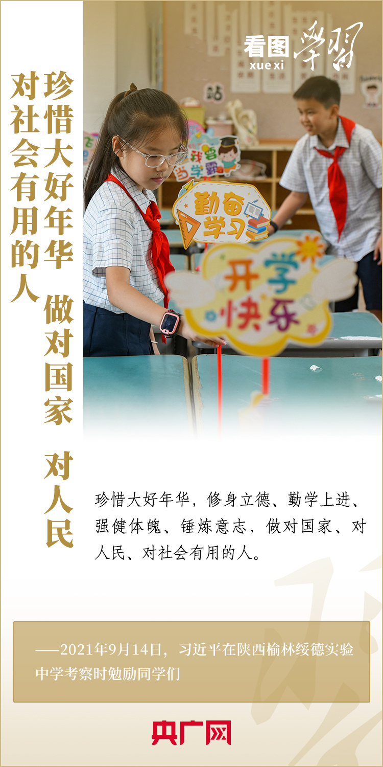 “少年儿童是祖国的未来。”一直以来,习近平总书记高度重视和关心青少年的健康成长。每每走到校园和学生们中间,总书记总会与他们谈学习、谈理想、谈成长,鼓励他们努力为自己赢得人生出彩的机会,做对国家、对人民、对社会有用的人。又是一年开学季,让我们一起重温总书记对莘莘学子的殷切期望。一起来学习!