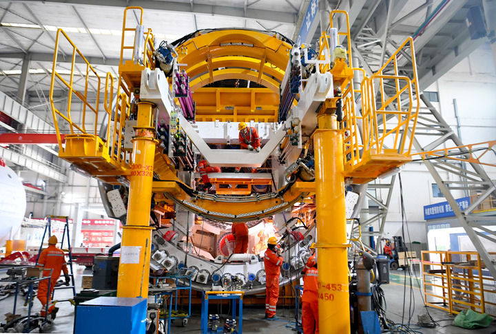 3月15日,工人在位于河南郑州的中铁装备集团车间内进行盾构机主驱动清理作业。新华社记者李嘉南摄