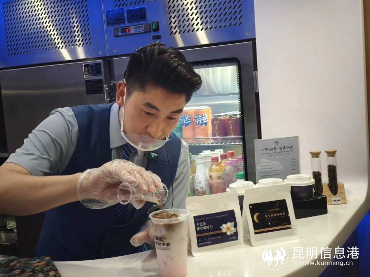 中老铁路“一路咖香”现磨咖啡备受旅客好评,餐吧工作人员正在为旅客制作玫瑰特调。李婧 摄