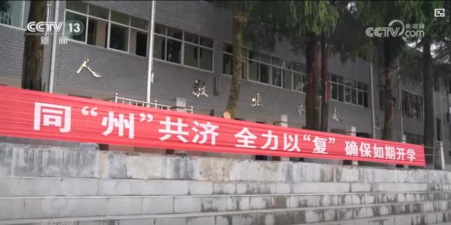 李春江:“‘州’指的是州门司镇中学,同‘州’共济的寓意就是整个教育系统,包括整个党和政府,还包括我们教育系统,都在与我们共同应对天灾,共同战胜困难;全力以‘复’的‘复’,我们用的是复学的‘复’,指我们将加班加点克服困难,确保每一个孩子不因灾失学,确保我们的开学要如期进行。”