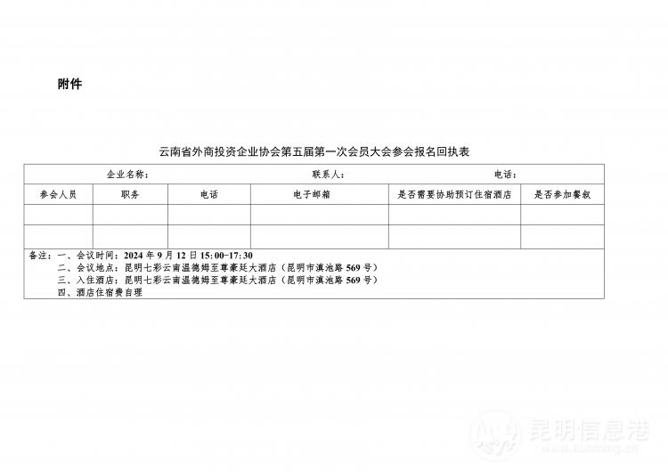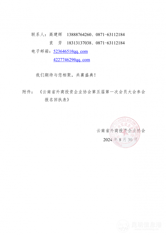 昆明信息港讯 杨建东报道 云南省外商投资企业协会近日宣布,将于2024年9月12日(星期四)15:00在昆明七彩云南温德姆至尊豪廷大酒店隆重召开第五届第一次会员大会。此次大会标志着协会发展历程中的一个新起点,对于促进外商投资企业的交流与合作具有重要意义。