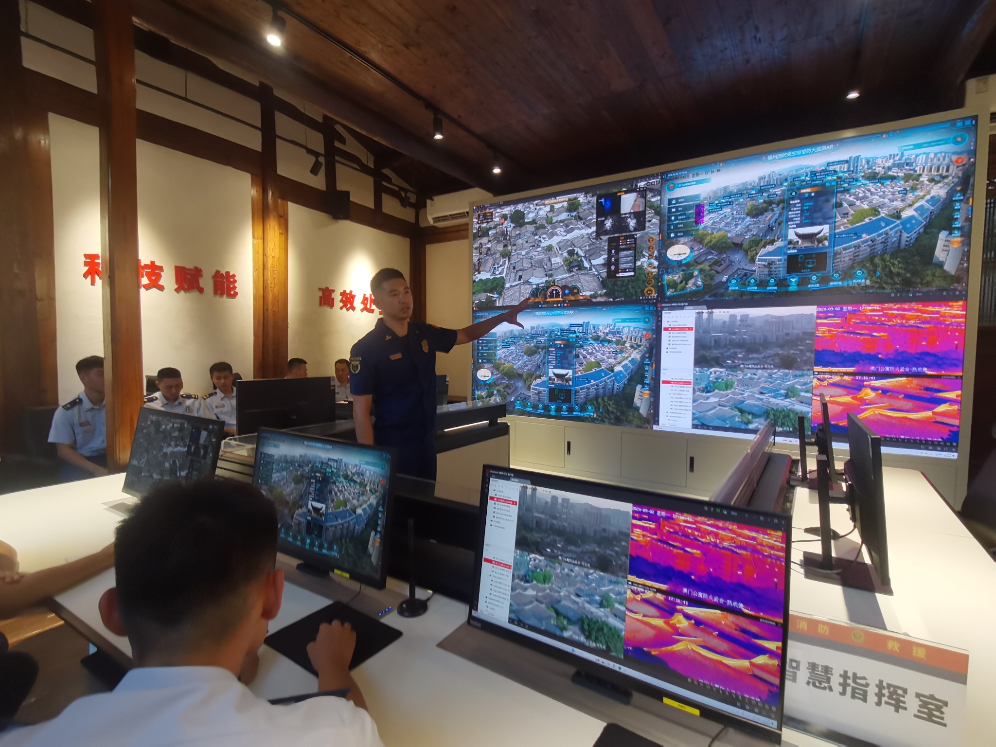 在服务站智慧指挥室内,三坊七巷消防救援站副站长张天水介绍,为守护古厝消防安全,他们自主研发了火灾防控“一张图”系统,优化升级消防车辆装备结构和“一二三”灭火救援快速响应机制,在三坊七巷一南一北两个最高点的楼顶,还分别配设了高空预警“鹰眼”“火眼”系统。“火眼”系统可以对景区进行24小时全方位监控和30秒一轮的巡航监测。“鹰眼”系统则可通过超高清摄像头俯视取景,生成AR实景地图,实现对景区的空中总览。