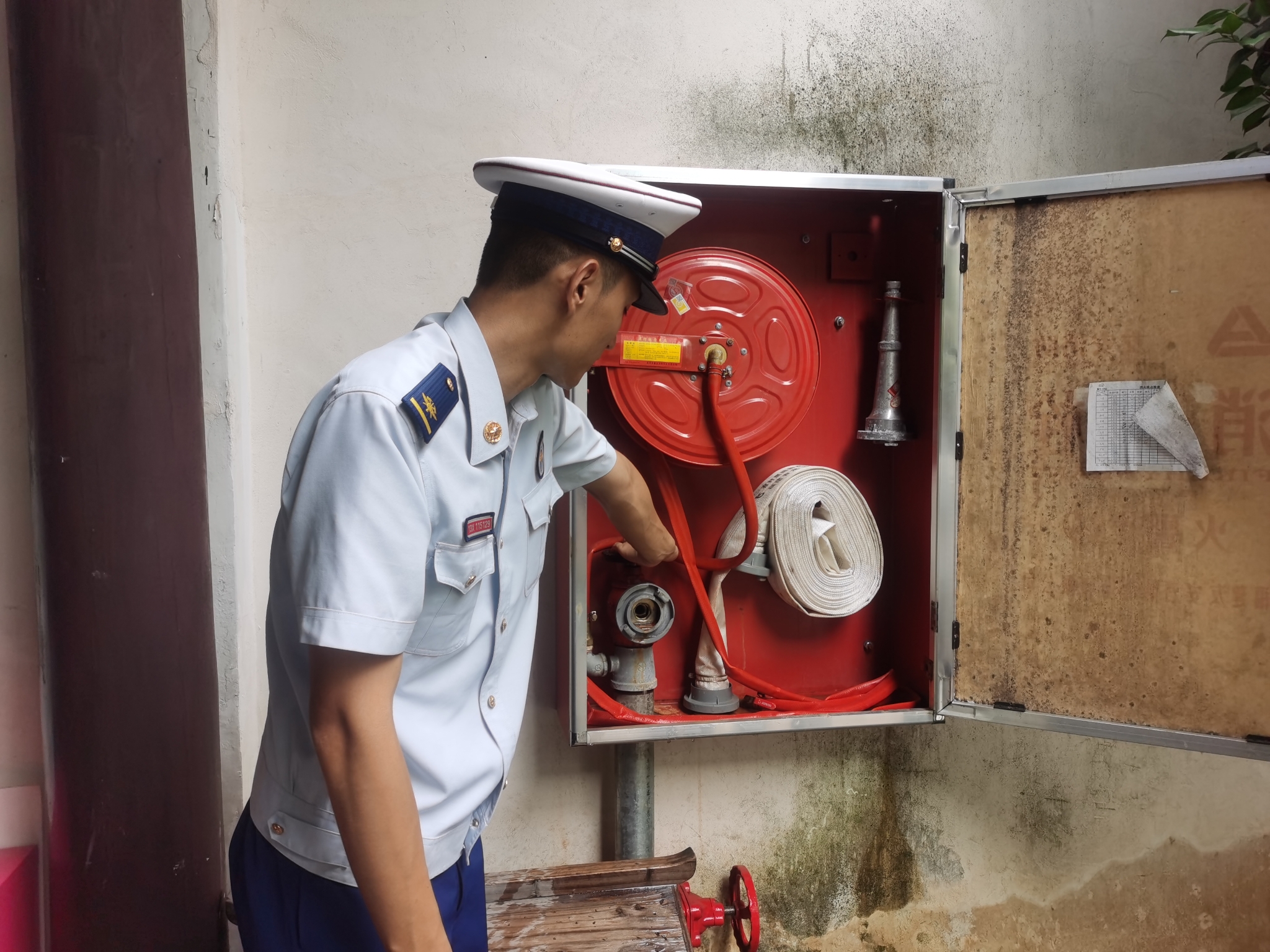 9月3日上午9点左右,三坊七巷消防救援站消防员范良腾和队友开始了坊巷例行38家的日常防火巡查工作,巡查内容包括检查空气采样烟雾报警系统、灭火器、应急灯、电线排管以及消防器材是否正常使用等情况,早晚各一次。