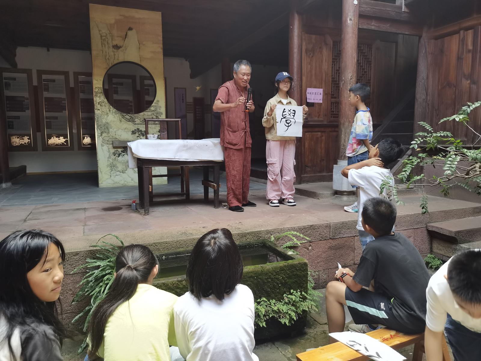 在清幽古朴的碧溪社区党群服务中心内,50余名孩童身穿汉服,正在认真听讲。通海书法家协会的林启龙老师分别用篆、隶、草、行等书体写下“碧”“溪”等字,并赏析字体结构、介绍碧溪的由来历史,陶冶孩子们的情操,在孩子心中种下爱祖国爱家乡、爱书法的种子,也勾勒出诗和远方。