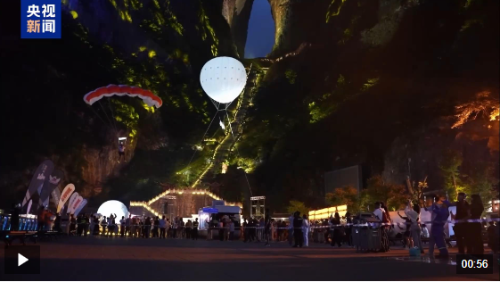 随着夜幕降临,天门洞灯光璀璨,营造出一种梦幻般的氛围。中国古老神话故事“嫦娥奔月”惊喜亮相,演员扮演的“嫦娥”身披轻纱,伴随着古风的优雅旋律,轻盈升空,衣袂随风飘扬,在空中翩翩起舞。与此同时,十多名翼装飞行运动员化身跳伞健将,从山顶疾速俯冲而下,与嫦娥共舞于夜空之下。这一传统与现代的奇妙组合,将全场的气氛推向高潮。