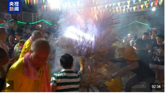 中秋节的晚上,人们点燃番塔,令火焰夹带星火向上升,激起金色火花四射。不断往上冲的火花,冲得越高就寓意来年越丰收、越兴旺。