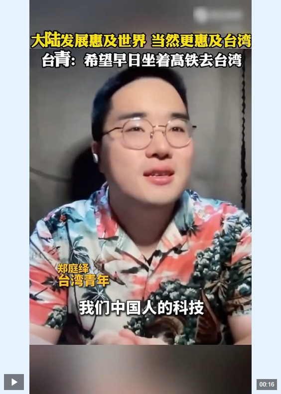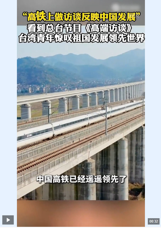 岛内舆论从“在高铁上做访谈”看到了大陆的科技发展。台湾青年潘柏铨表示,高铁上做访谈,画面稳当、信号流畅的背后是先进技术的支撑,其实西方的铁路运输比大陆发展得早,但大陆现在已经遥遥领先。台湾青年阙郁璇上周刚体验了新开通的杭温高铁,她认为,高速行进的列车体现了中国科技发展的迅速。台青江宇截表示,先进的高铁技术其实只是大陆众多在世界领先领域的代表,无论是电动汽车、无人机,还是备受关注的华为手机,都展现了大陆的发展成果。