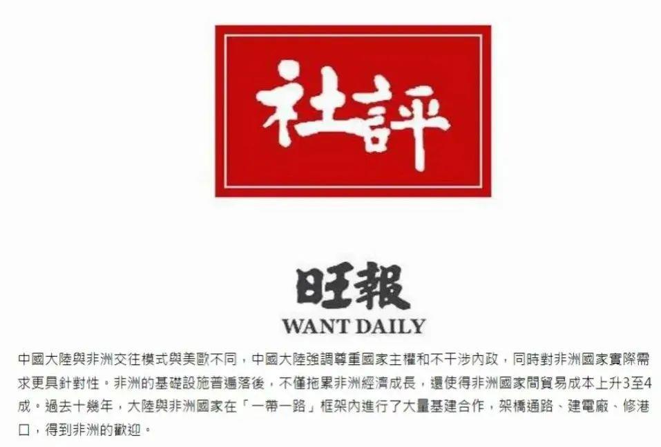台湾《旺报》社评指出,过去十几年,大陆与非洲国家在“一带一路”框架内进行了大量基建合作,架桥通路、建电厂、修港口,得到非洲的欢迎。