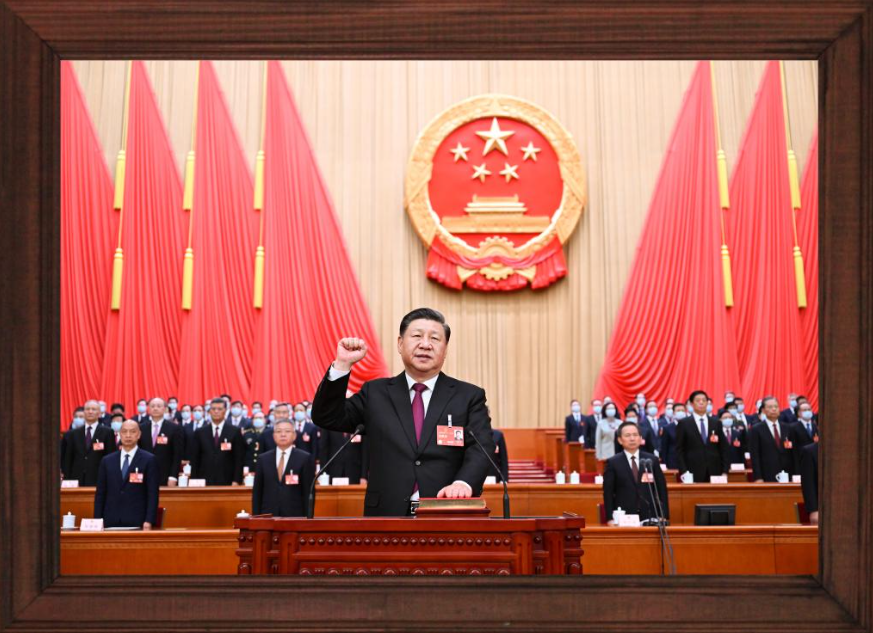 2023年3月10日,北京人民大会堂。全票当选国家主席、中央军委主席的习近平,左手抚按《中华人民共和国宪法》,右手举拳,面向近3000名全国人大代表,郑重宣誓。