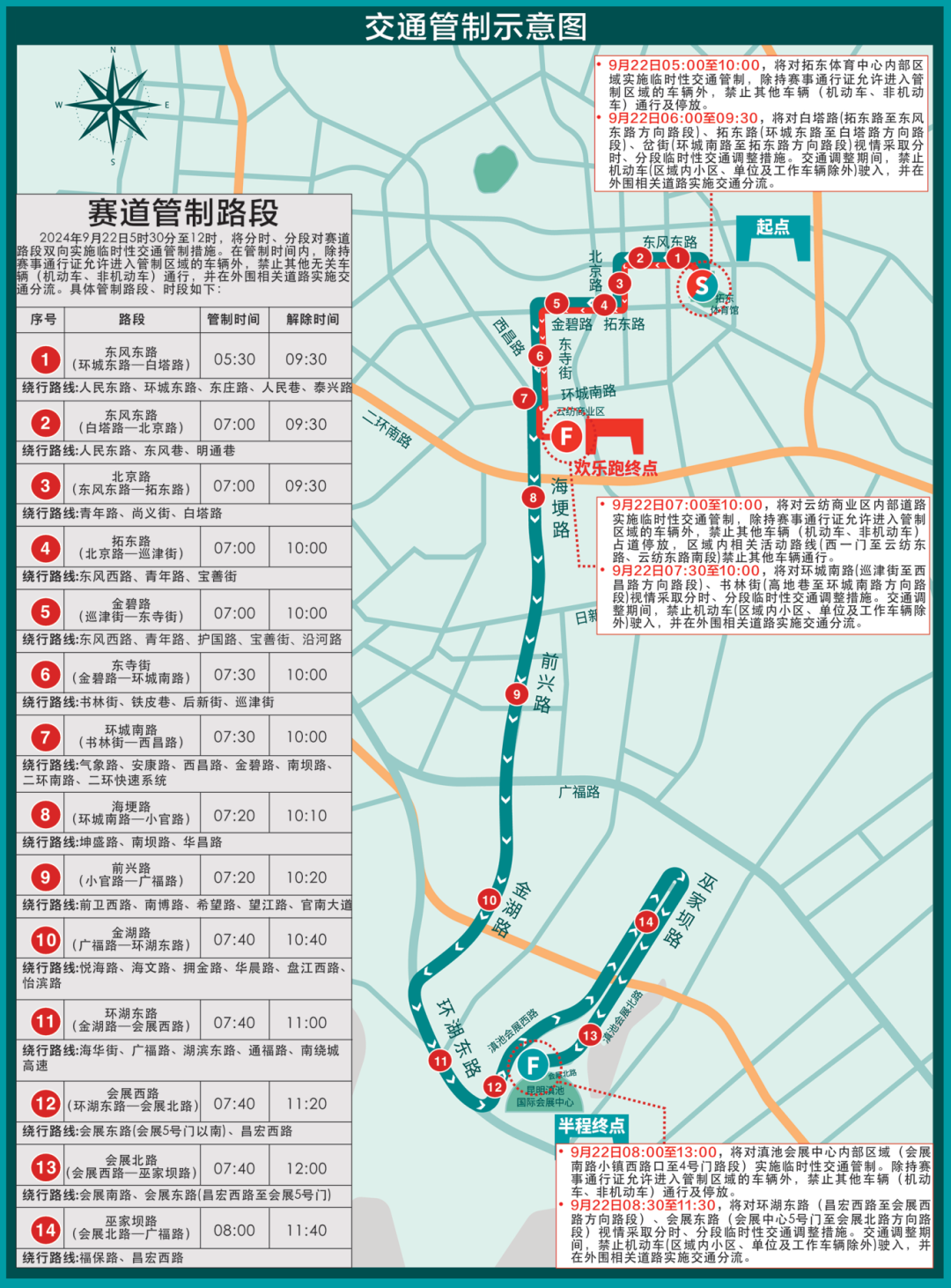 1.9月22日7:00至10:00,将对云纺商业区内部道路实施临时性交通管制措施。除持赛事通行证允许进入管制区域的车辆外,禁止其他车辆(机动车、非机动车)占道停放,区域内相关活动路线(西一门至云纺东路、云纺东路南段)禁止其他车辆(机动车、非机动车)通行。