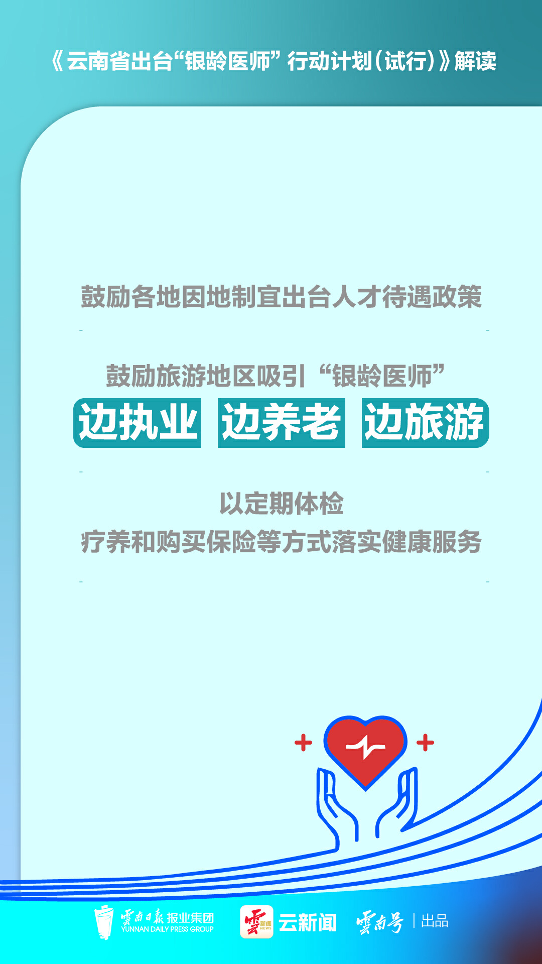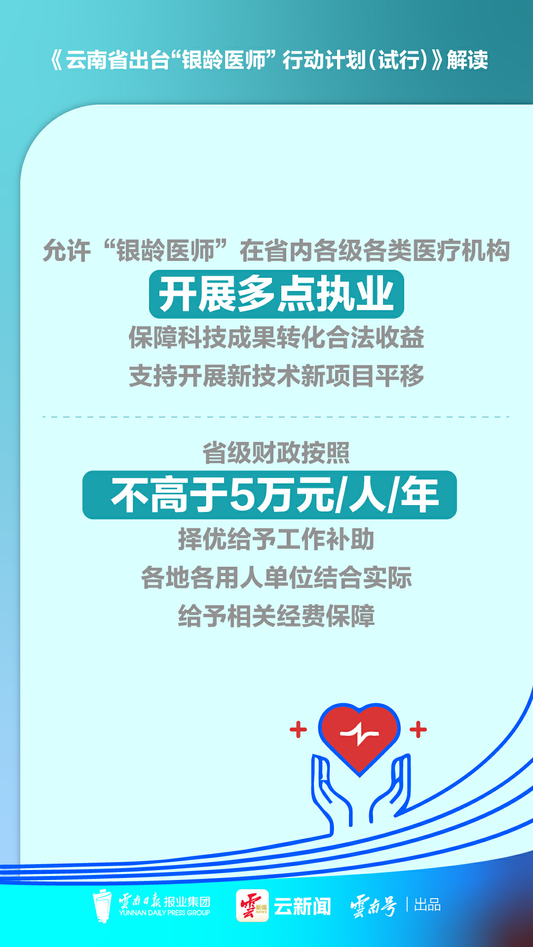 近日,省人民政府办公厅印发《云南省“银龄医师”行动计划(试行)》,聚焦当前云南卫生健康人才队伍存在的短板问题,从4个方面提出20项具体举措,吸引省内外退休医疗卫生人才到全省各级公立医疗卫生机构服务。