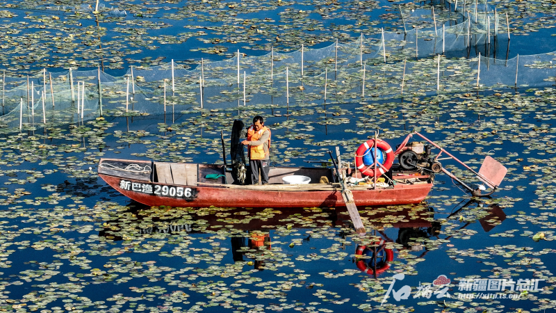 9月20日,养殖户在博斯腾湖上捕捞螃蟹(无人机摄)。石榴云/新疆日报记者 周鹏摄