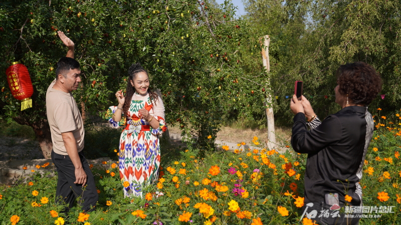 9月21日,吐鲁番市托克逊县博斯坦镇举办喜迎中国农民丰收节“魅力红枣情 幸福托克逊”红枣采摘开园仪式。图为助农直播电商在枣园内现场直播。宋建泽摄