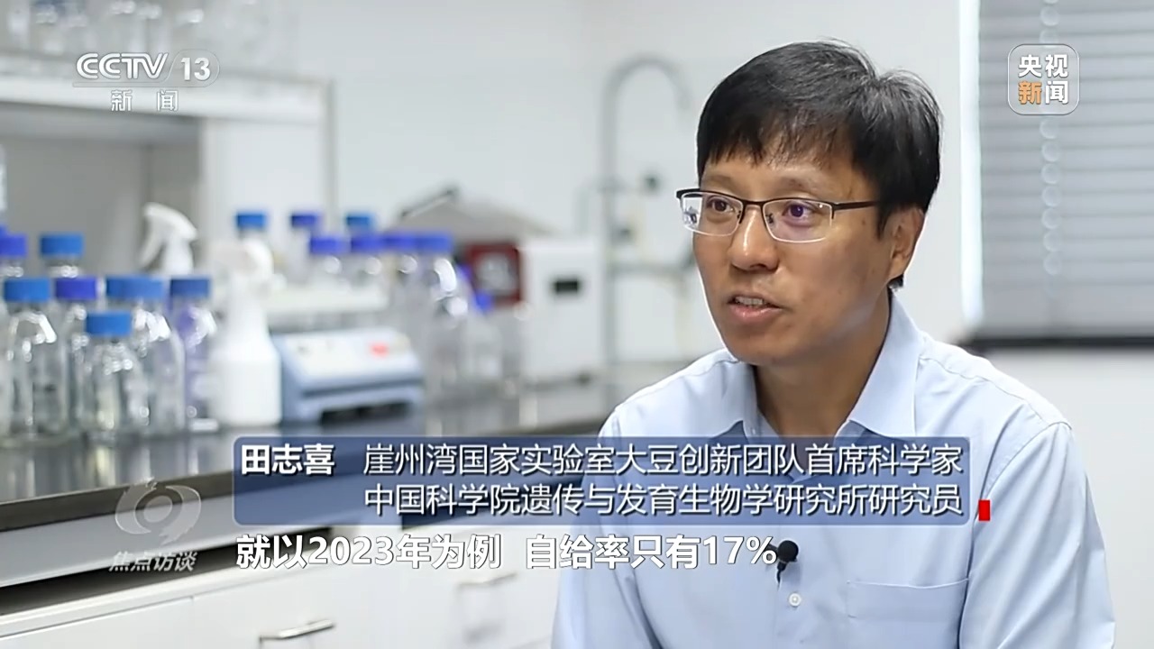 崖州湾国家实验室大豆创新团队首席科学家、中国科学院遗传与发育生物学研究所研究员 田志喜:中国大豆的自给率太低了,以2023年为例,只有17%,在这种情况下,保证我们粮食安全,大豆义不容辞、责无旁贷,提高它的自给率。