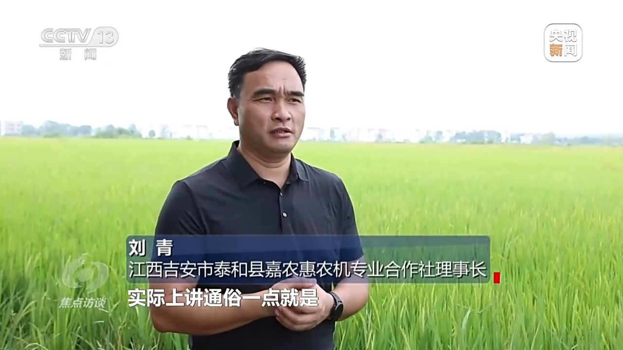 江西吉安市泰和县嘉农惠农机专业合作社理事长 刘青:实际上我们就是农民的“田间保姆”,农民雇佣我们,我们做他的保姆,为他田里面的稻子种植整个过程,做一个保姆式服务。