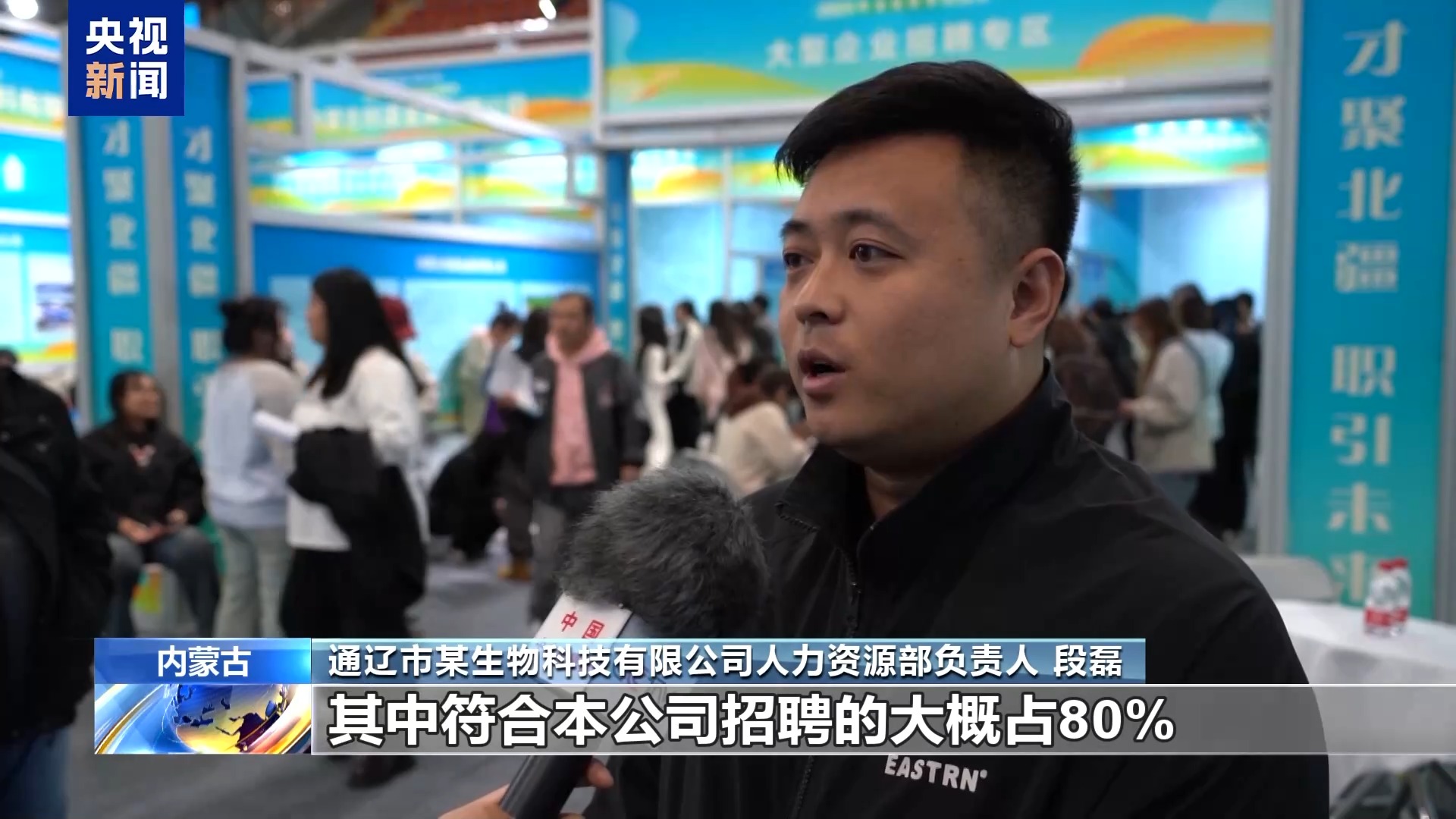 通辽市某生物科技有限公司人力资源部负责人 段磊:有意向人员大概有60多人,其中符合本公司招聘的人员大概占80%。筛选通过之后到公司面试,在一个星期内我们就完成人员快速到岗。