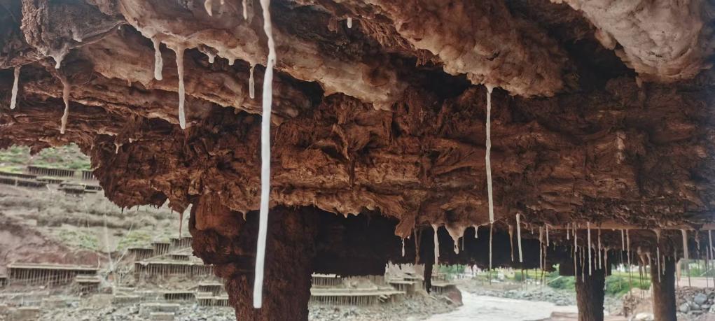 西藏芒康县纳西民族乡的盐棚下,梁上垂下盐柱。新华社记者侯韶婧摄