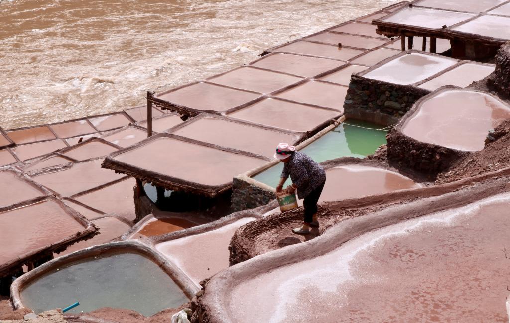 “相传文成公主进藏时在这里休息。仆从煮水烧茶时,连舀三桶泉水都是咸的。”一番劳作后,村民扎西拉姆讲起故事,“从此人们开发盐井,在陡坡上层层架木、敷泥浇卤,形成了盐田。”
