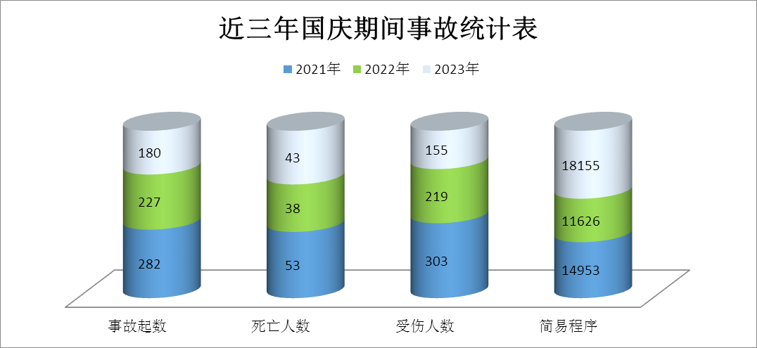 近三年国庆假期,全省平均发生一般程序处理的道路交通事故230起,平均发生简易程序处理的交通事故14911起。其中,2021年、2022年、2023分别发生交通事故282起、227起、180起。从简易程序处理的道路交通事故情况看,近3年分别发生交通事故14953起、11626起、18155起(如图1所示)。
