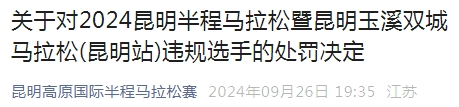9月26日,2024昆明半程马拉松组委会发布《关于对2024昆明半程马拉松暨昆明玉溪双城马拉松(昆明站)违规选手的处罚决定》称,组委会根据录像、图片材料和相关参赛者举报,确认一名选手存在替跑行为,根据相关规定对该选手进行处罚。全文如下