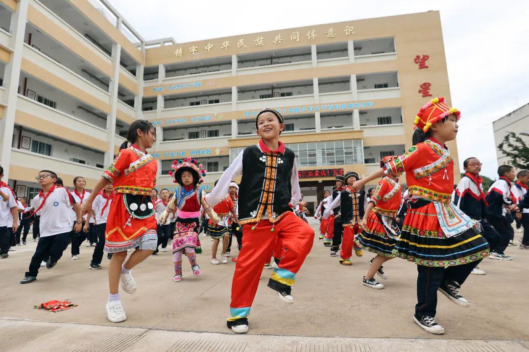 大理永平北斗乡九年制学校,学生跳民族舞,唱民族歌当做课间操。云南日报社记者陈飞/摄