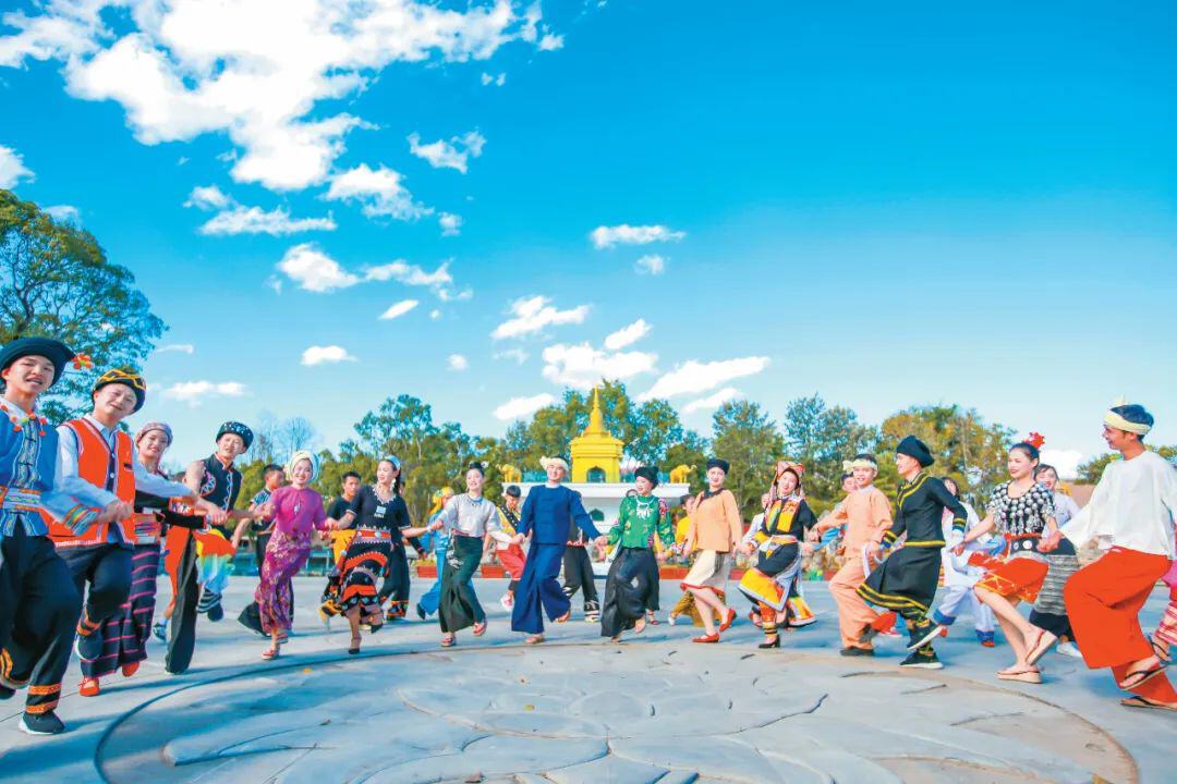 云南是边疆多民族省份,26个世居民族亲密融洽,是祖国统一多民族大家庭的“缩影”。图为各族群众在临沧市耿马县甘东瀑布公园载歌载舞。耿马县融媒体中心供图 艾青/摄