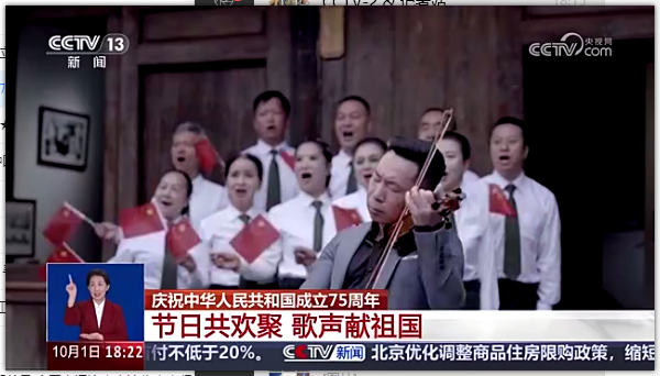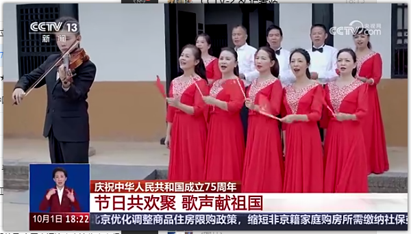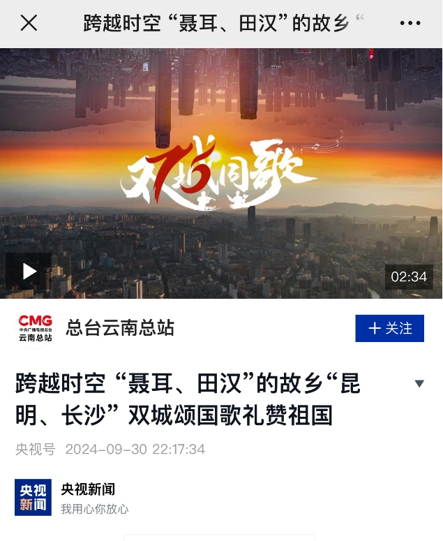 “在国歌曲作者聂耳和词作者田汉的出生地,云南昆明和湖南长沙,两地以空中音符为纽带,赓续红色血脉,双城合唱团联动,同频共振,唱响国歌,歌声在空中回荡,既是向先辈致敬,也传递着人们对祖国的无限热爱与真挚祝福……”10月1日,中央广播电视总台新闻频道《共同关注》栏目报道了由昆明市融媒体中心发起的“跨越时空 双城同歌”音乐快闪活动。