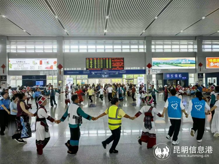 节假日期间,国铁昆明局在部分列车和车站组织开展了庆祝活动,弥勒站、普者黑站与D8674次列车站车联动,开展民族歌舞表演,与旅客互动,进行有奖问答,赠送南昆客专印章集,旅客可以到石林西、弥勒、普者黑、广南县等车站进行集章打卡,为旅客留下一个难忘美好的出行体验。