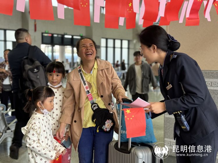 针对国庆期间客流旺盛的情况,国铁昆明局在“金花”“阿诗玛”“红石榴”服务台开展喜迎中秋国庆志愿服务活动,免费提供茶水、加固打包行李、发放小礼品、提供集章打卡等服务,让旅客出行之路更温馨。列车上以“迎国庆、庆华诞”为主题的装饰,格外引人注目。身穿特色民族服饰在车厢里载歌载舞,与旅客热情互动,车外自然风光宜人,车内民族风情浓郁,让旅客感受到旅途的温馨与舒适。