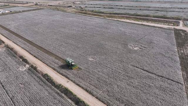 现代化的采棉机在棉海中穿梭