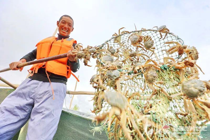 △在库车市玉奇吾斯塘乡跃进水库养殖基地,蟹农忙着捕捞天山雪蟹。吴乐摄