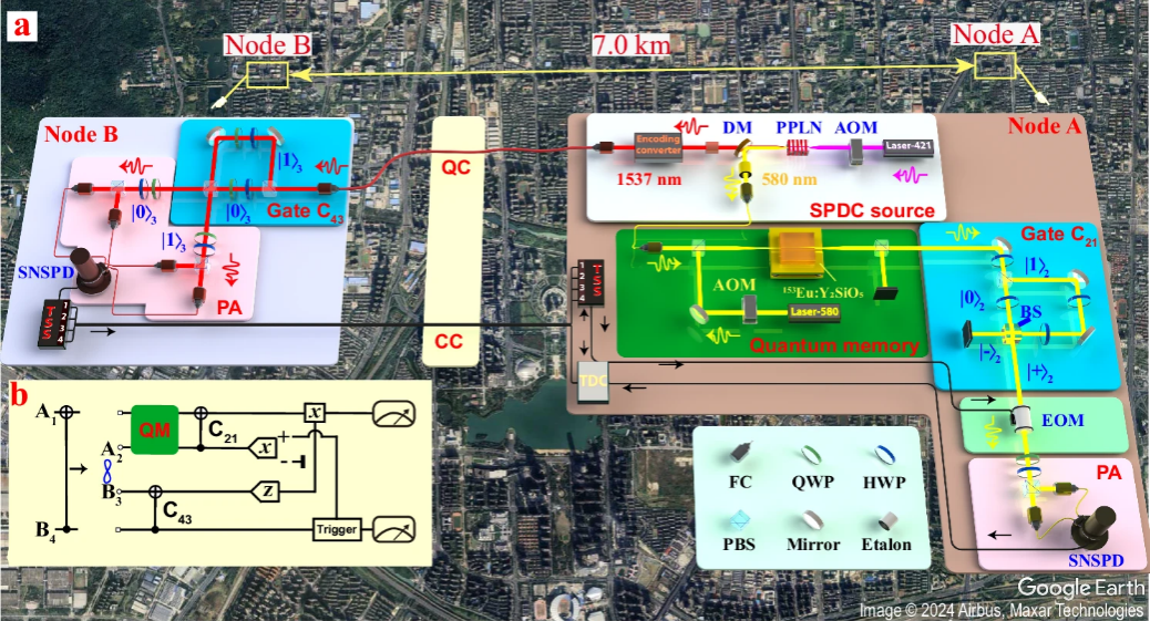 研究团队基于量子门隐形传送协议,建立两个量子节点之间的非局域量子门。两个量子节点之间的直线距离为7公里,分别位于中国科学技术大学东校区和合肥市大蜀山东侧。研究团队首先在两节点间使用通信波段光子和专线光缆进行了量子纠缠态的远程分发。随后,中国科大节点和大蜀山节点分别执行本地的两比特量子门操作。中国科大节点采用掺铕硅酸钇晶体实现纠缠光子的存储,直到接收到大蜀山节点的测量结果,并根据这一结果执行相应的单比特门操作。