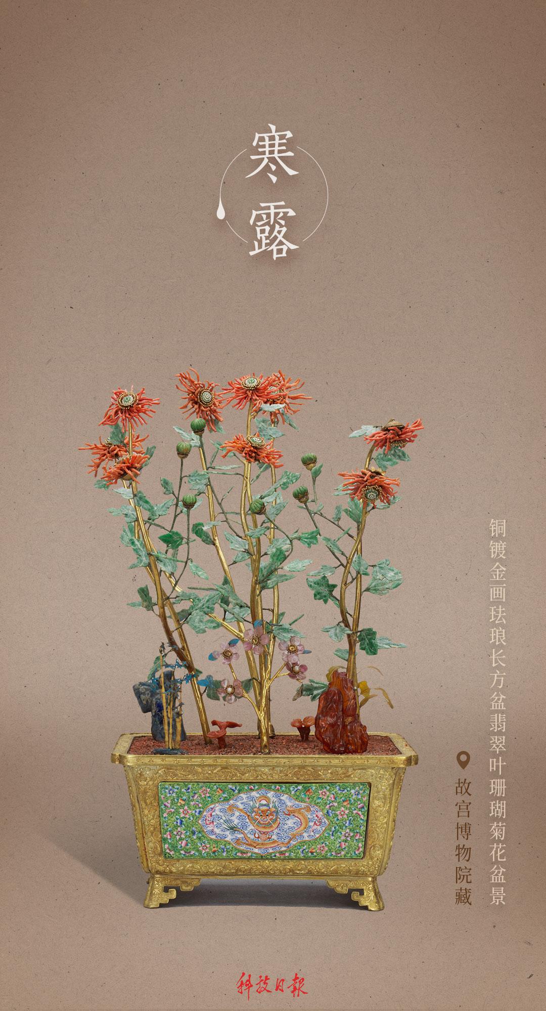 “寒露惊秋晚,朝看菊渐黄。”北京时间10月8日迎来了寒露节气。秋风送爽、大雁南归,各色菊花竞相绽放。菊花是花中四君子,古人爱菊之潇洒隐逸、高尚独立,擅以音韵、形象将花物来组合,搭配成内涵丰富的吉祥纹样。无论是宫廷织物上连绵不断的万字纹搭配菊花寓意长寿,还是盆景、屏风等装饰艺术中菊花与蝙蝠(福)、仙鹤(寿)、桂花(贵)等吉祥元素的结合,都展现了菊花丰富的文化内涵。