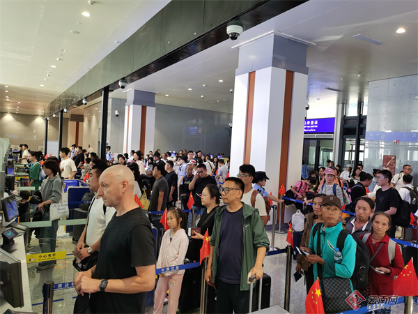 国庆假期,每当列车准点到达时刻,中老铁路磨憨口岸出入境大厅内,比起平时更加的热闹非凡、人潮熙攘。