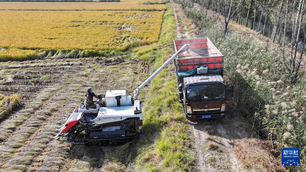 10月11日,在天津市宁河区东赵庄村,农民驾驶收割机将收获的水稻转运至运输车(无人机照片)。新华社记者 孙凡越 摄