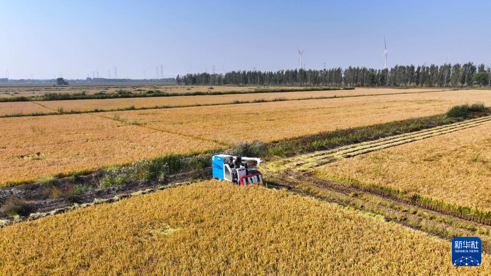 10月11日,在天津市宁河区东赵庄村,农民驾驶收割机收割水稻(无人机照片)。新华社记者 孙凡越 摄