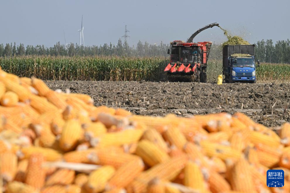 10月11日,在天津市宁河区东赵庄村,农民驾驶大型机械收割玉米。新华社记者 孙凡越 摄
