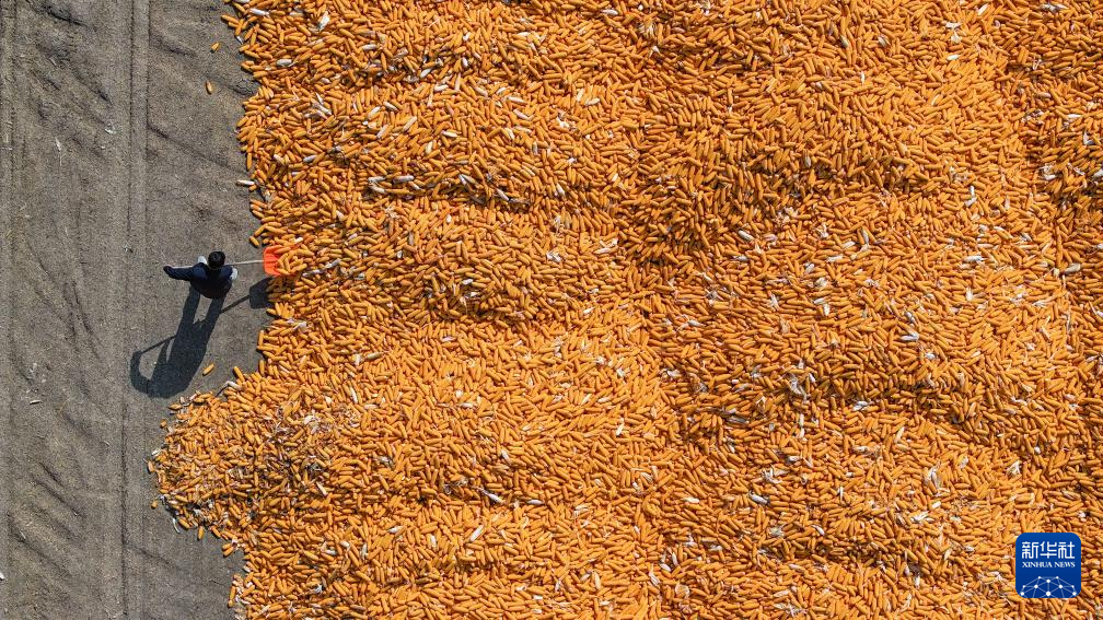 10月11日,在天津市宁河区东赵庄村,农民晾晒刚收获的玉米(无人机照片)。新华社记者 孙凡越 摄