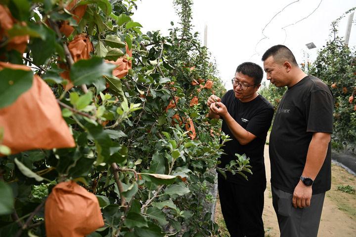 延安市安塞区果业技术推广中心主任张刚(左)在果园观察果树长势(2024年8月8日摄)。新华社记者 邹竞一 摄