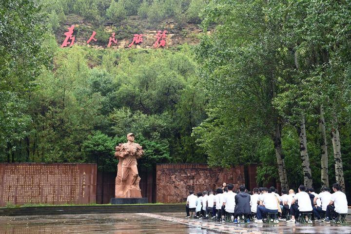 晨光熹微,延安枣园。宝塔消防救援站的消防员们,来到张思德纪念广场诵读名篇,缅怀先烈。