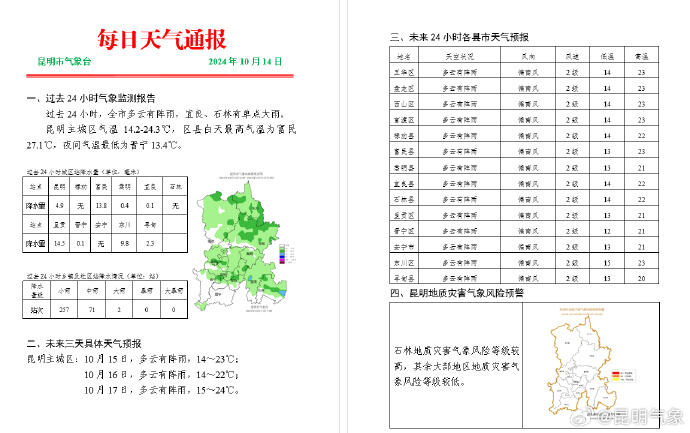 其中,10月14日曲靖市、文山州北部(丘北县、广南县、砚山县)、红河州北部(弥勒市、泸西县、开远市)、昆明市东南部(石林县、宜良县)有中雨局部大雨、暴雨。