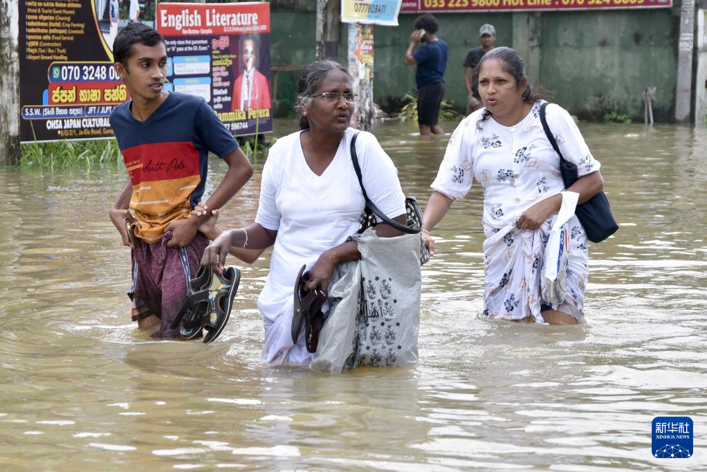 10月12日,在斯里兰卡加姆珀哈,人们经过被淹没的街道。新华社发(加扬·萨米拉摄)