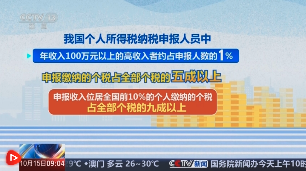 数据显示,我国个人所得税纳税申报人员中,年收入100万元以上的高收入者约占申报人数的1%,但这部分人申报缴纳的个税占全部个税的五成以上,申报收入位居全国前10%的个人缴纳的个税占全部个税的九成以上。