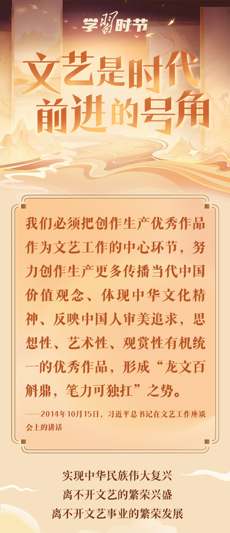 文艺事业是党和人民的重要事业,文艺战线是党和人民的重要战线。2014年10月15日,习近平总书记主持召开文艺工作座谈会并发表重要讲话,为推动新时代文艺繁荣发展指明了前进方向。文艺是时代前进的号角,最能代表一个时代的风貌,最能引领一个时代的风气。十年来,在习近平总书记的指引下,我国文艺面貌发生深刻变化,一系列代表性作品、标志性现象和时代性特征,勾画了新时代文艺的独特景观,彰显了新时代文艺的丰富内涵。