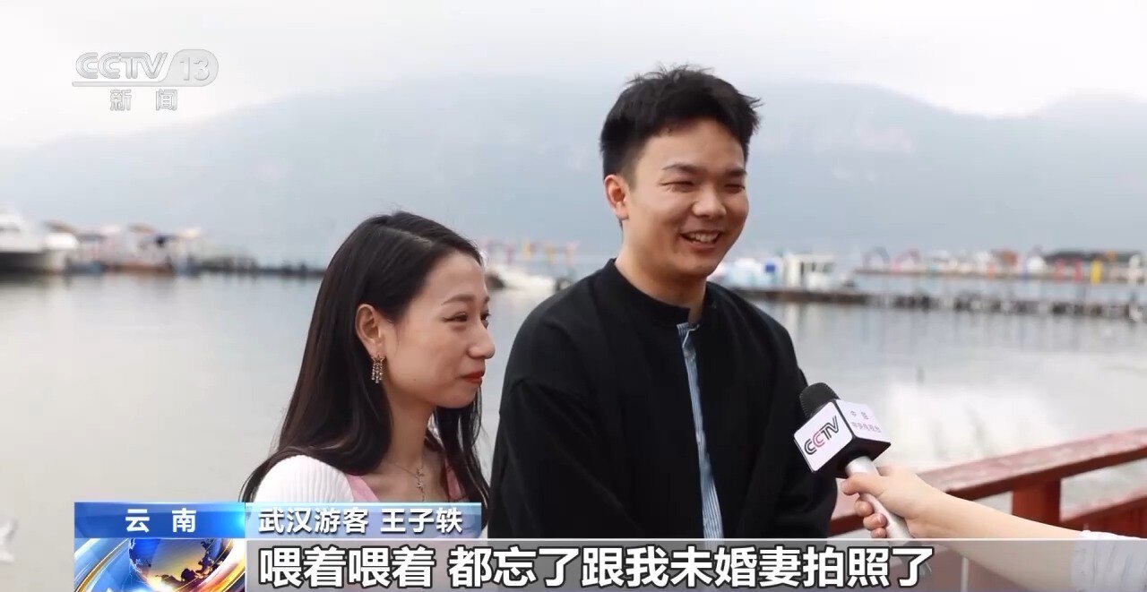 武汉游客 王子轶:喂着喂着都忘了跟我未婚妻拍照了,后面我们都一起拍了很多好看的照片,这也算是给我们这趟旅行一个新婚礼物吧。