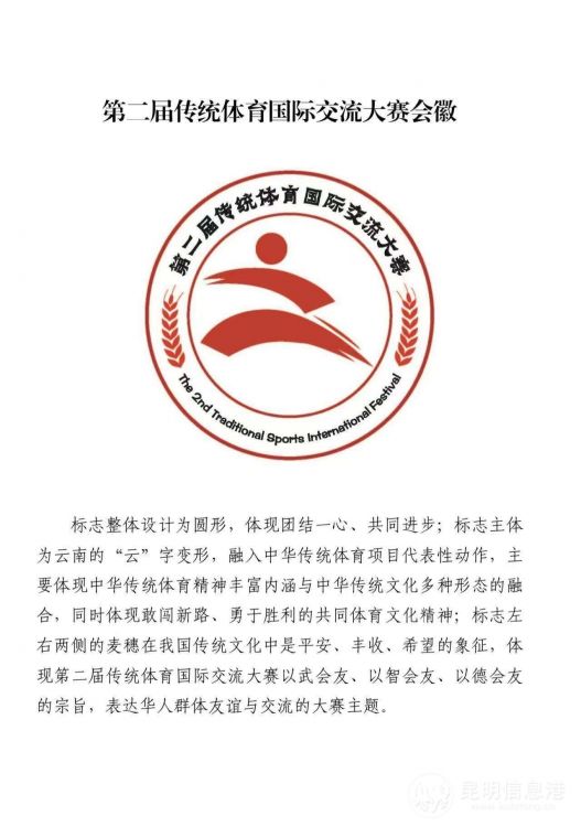 据大赛组委会相关负责人介绍,第二届传统体育国际交流大赛会徽标志整体设计为圆形,体现团结一心、共同进步。标志主体为云南的“云”字变形,融入中华传统体育项目代表性动作,主要体现中华传统体育精神的丰富内涵与中华传统文化多种形态的融合,同时体现敢闯新路、勇于胜利的共同体育文化精神;标志左右两侧的麦穗在我国传统文化中是平安、丰收、希望的象征,体现第二届传统体育国际交流大赛以武会友、以智会友、以德会友的宗旨,表达华人群体友谊与交流的大赛主题。